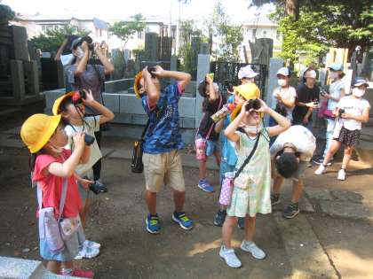 7月1日、今年度初めて探鳥会を豪徳寺で実施するkとが出来ました。早朝でしたが、楽しみに参加した子どもたちは21名いました。子どもたちは、野鳥ボランティアの方の説明をよく聞き、野鳥のさえずりに耳を傾け、持参した双眼鏡で木立を見上げました。残念ながらアオバズクの姿を見つけることはできませんでしたが、早朝の豪徳寺で有意義な時間を過ごすことができました。