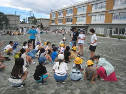 7月8日、1〜6年生の縦割り班活動として「ともあそび」を昼休みに行いました。校庭では6年生が中心となって1〜6班が「ドッジボール」「しっぽ取り」などで遊び、異学年間の交流を深めました。