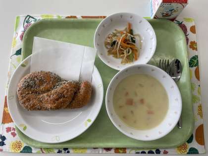 献立 セサミ揚げパン じゃが芋のポタージュ 野菜のコチジャンダレ 牛乳