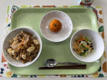 献立 豚キムチ丼 みそドレサラダ 冷凍みかん 牛乳