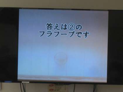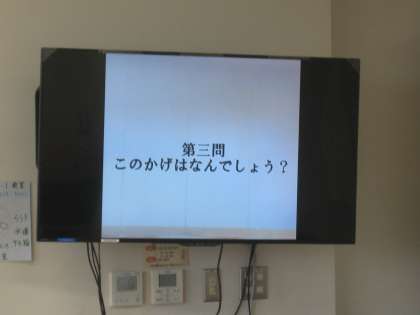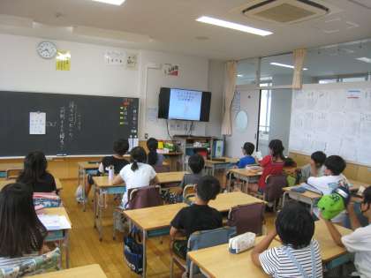 7月19日、朝の活動時間にテレビ放送による児童集会を行いました。内容はスクリーンに映した影が何かを当てるクイズです。教室で子どもたちは3択問題をそれぞれ考え、回答していました。