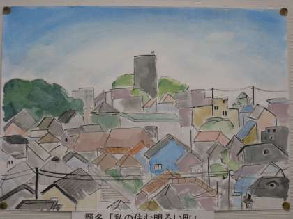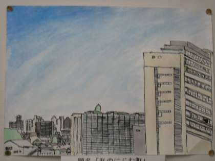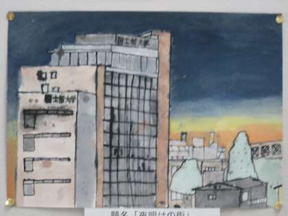 工室前の廊下壁面に6年生の図工作品を展示しました。題材名は「私たちの住む街」、屋上で近隣の風景を観察しスケッチした絵をもとに葦ペンを使って墨で線描きし、水彩絵の具を薄く着彩して淡彩画を仕上げました。子どもたちは、屋上から見下ろした街の景観に興味をもって風景画を描きました。愛着の込められた数多くの力作が仕上がりました。