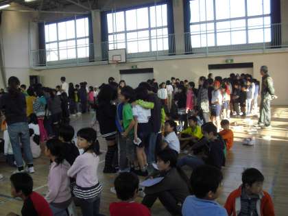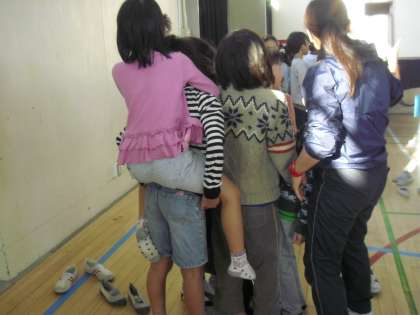 11月24日(木)の児童集会は、集会委員会の企画で「たから島ゲーム」を行いました。毎月1回行う「ともあそび」の時の縦割り班(1年生から6年生までの合同班)で集まって、まず大きく広げた新聞紙の上に全員で乗ります。舞台上の集会委員と、班の代表者でじゃんけんをします。じゃんけんに勝つと、新聞紙を倍の大きさに広げます。あいこのときは、そのままの大きさ。負けると新聞紙を半分にたたみます。その大きさの新聞紙の上に、班の全員が乗って、5秒間全員の足が出なければOKです。新聞紙が狭くなった班は、上級生が下級生をおんぶしたり抱っこしたり、新聞紙から足が出ないようにいろいろ工夫していました。異学年で楽しく触れ合うことができた集会でした。