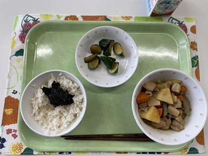 献立 七分付ご飯 のりの佃煮 根菜のそぼろ煮 きゅうりの南蛮漬け 牛乳