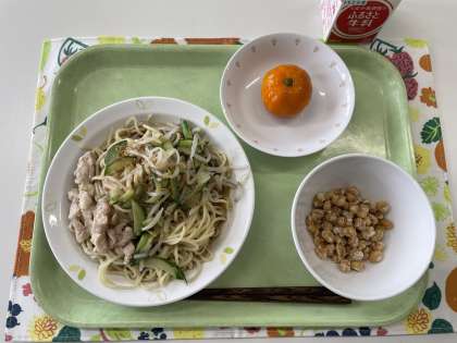 献立 冷やし中華(蒸し鶏) ポリポリ大豆 冷凍みかん 牛乳