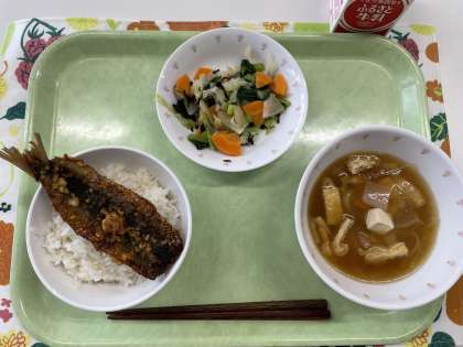 献立 イワシの蒲焼丼 ぶた汁 塩こんぶのサラダ 牛乳