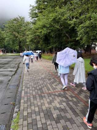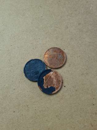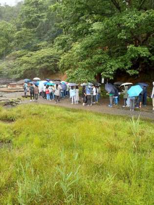 源泉で、持ってきた10円玉の変化を確かめました。「玉子のにおいがする」「水が熱いよ」と言いながら10円玉をひたしました。