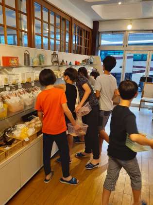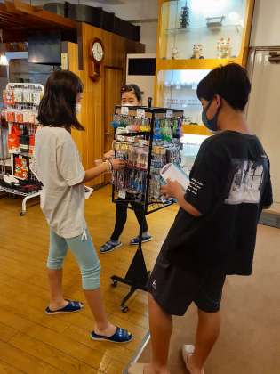 宿に戻ってきて、少し冷えた体をお風呂に入って温めます。順番を待っているクラスは、お土産タイムになっています。限られた予算で何を買おうか、みんな真剣です。みんな元気です。