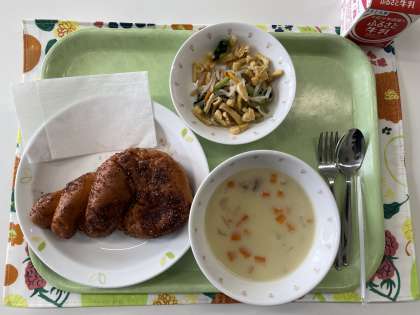 献立 ココアあげパン じゃがいものポタージュ 油揚げのサラダ 牛乳