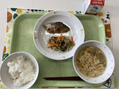 献立 ごはん 鰆の梅だれ焼き 和風ナムル かきたま汁 牛乳