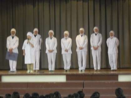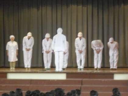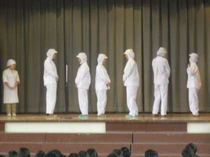 11月28日(月)の児童朝会は、「給食室からのお話」ということで、毎日おいしい給食を作ってくださっている、給食室の調理員さんたちのお話を聞きました。白衣姿の調理員さん達が壇上に上がると、子どもたちもびっくり!