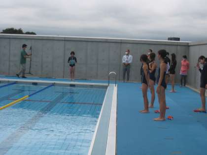 9月8日、5・6年生による校内水泳記録会を3年ぶりに実施しました。新型コロナウイルス感染症対策のため、開会式は50m自由形・平泳ぎに参加する児童のみプールサイドで参加し、他の児童は教室待機で中継により視聴しました。開会式では、5年児童によるはじめの言葉、校長先生の話、競技場の注意がありました。競技種目は、自由形(50m、25m)、平泳ぎ(50m、25m)、男女別リレー(25m×8人)。肌寒い天候でしたが、子どもたちは各々の参加競技に精一杯取り組みました。