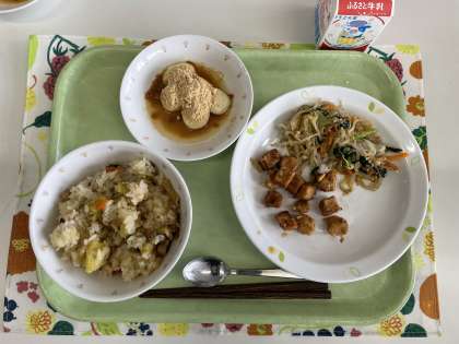 献立 さつまいもご飯 高野豆腐の唐揚げ ごまず和え 月見団子(きなこ) 牛乳
