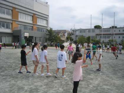 9月13日、中休み、10月に予定されている長縄大会へ向けて沢山のクラスが中休みや昼休みを利用して長縄跳びの練習を行っています。子どもたちも担任の先生も目標回数を達成するために頑張っています。