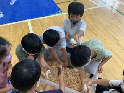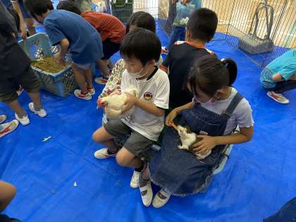 子供たちの手に収まる小ささのヒヨコやハツカネズミから、モルモットやウサギ、アヒル、チャボ、カモ、そしてヤギまで、全部で71匹の動物達と思いっきり触れ合いました。「ふわふわだ〜」「ひっかかれたけど、可愛い!」「アヒルは重たいぞ」など、貴重な体験を楽しむ声がたくさん聞こえてきました。