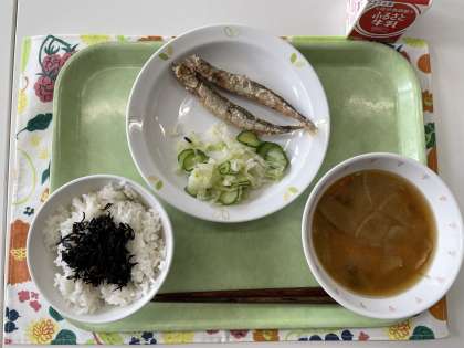 献立 七分付ご飯 ふりかけ 豚汁 ししゃもの唐揚げ ひとしお野菜 牛乳