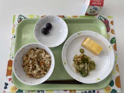 献立 こぎつねご飯 卵焼き 野菜のポン酢和え ぶどう 牛乳