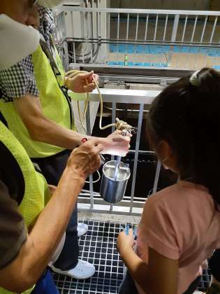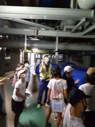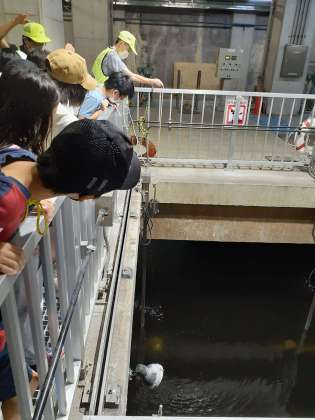 処理する水の過程を順番に見ていきました。はじめの汚れた水が、どのようになったか見て、臭いを確かめました。