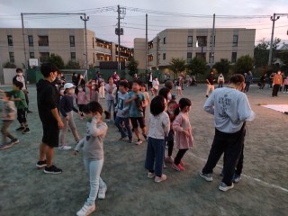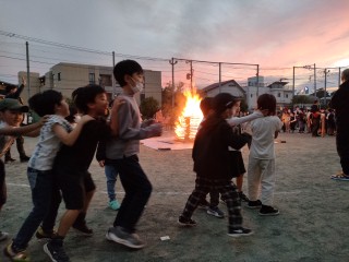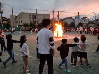 校庭の夕闇が深まり、キャンプファイヤーの炎が勢いよく燃えて、その炎を囲みながら子供たちが元気に踊っています。