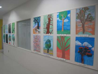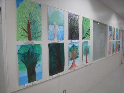 図工室前の壁面に5年生が描いた題材名「木々を見つめて」の作品を展示しています。子どもたちが身近なところで見ている木をモチーにして、木から受ける印象を大切にしながらアクリル絵の具を使って描きました。