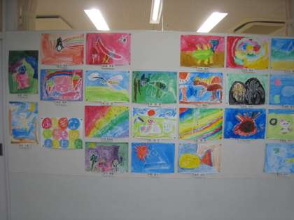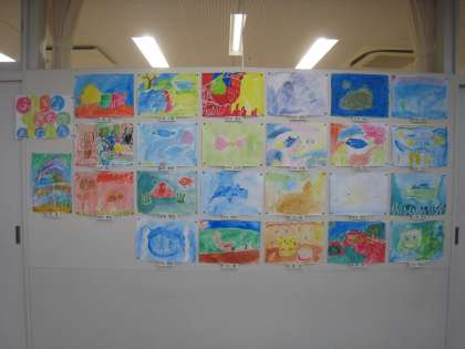 2年生の教室前の壁面に題材名「ふしぎないきものあらわれた」の作品を展示しています。白いクレヨンで画用紙に形を描き、水彩絵の具を薄く塗って白い線を浮き立たせる技法を使いました。