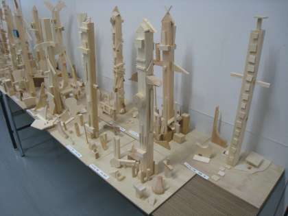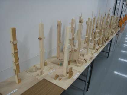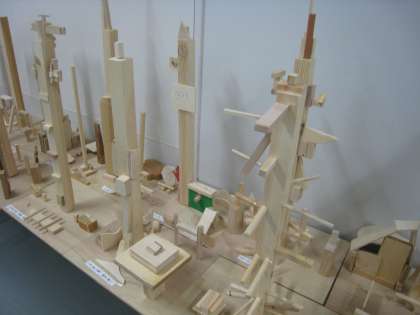 図工室前に3年生の木工作「城山タワー」を展示しています。子どもたちは土台に角材を打ち込み、必要なパーツを作ってボンドで接着しながら思い思いのタワーに仕上げました。