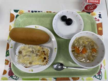 献立 あしたばパン ポテトグラタン ABCスープ ぶどう 牛乳