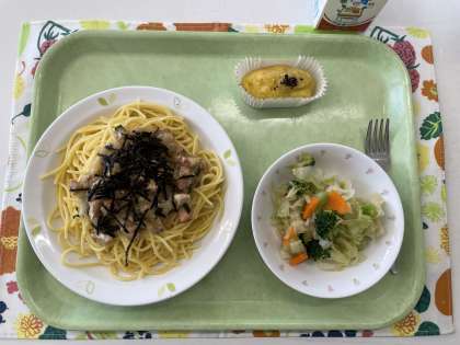 献立 鮭と大根おろしのスパゲティ キャベツとブロッコリーのサラダ スィートポテト 牛乳
