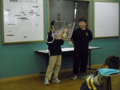 この日は、気温は低かったのですが、風もなく、絶好のお天気に恵まれました。はじめに、ウオッチングセンターで、愛鳥モデル校としての取組を学校ごとに報告しあいました。その後、二班に分かれて公園内の野鳥を観察しました。