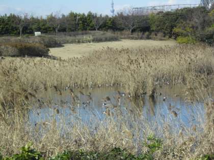 公園内の池では、準絶滅危惧種になっている大変珍しいセイタカシギを観察することができました。また、ホオハジロ、キンクロハジロ、オナガガモなどのたくさんのカモ類がいました。海沿いの渚の向こうには、スズガモの大群が羽を休めていました。その数はなんと10万羽以上!!また、東京都の鳥であるユリカモメも観察することができました。