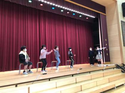 今日は、効果音を流したり、小道具を持ったりしながらの練習をしました。効果音に合わせて動くタイミングをつかむようにしました。みんな一生懸命に動きを考えています。学芸会まであと1週間です。校長先生から励ましの言葉をいただきました。