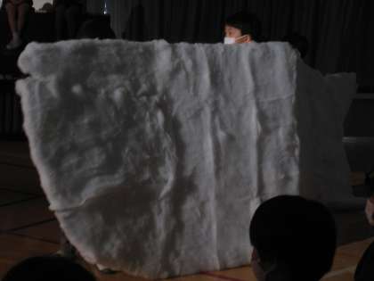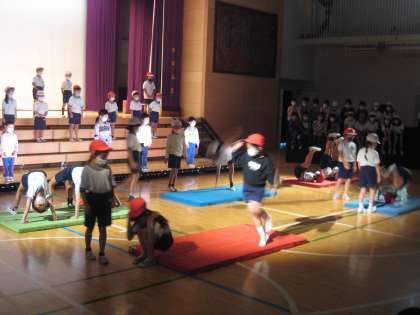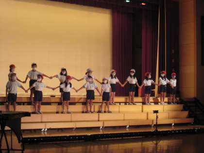 演目「くじらぐも」は、体育の時間という現実の世界から、幻想の世界で楽しみ、もとの現実の世界に戻るというファンタジー作品です。1年生の子どもたちは合唱や合奏を取り入れた音楽劇として元気よく演じることができました。