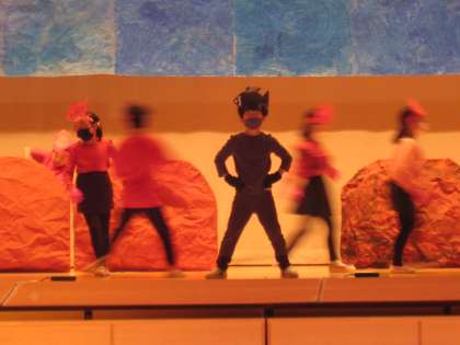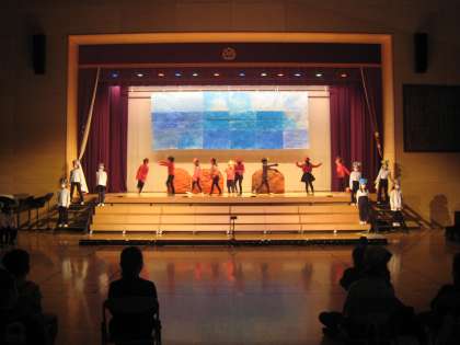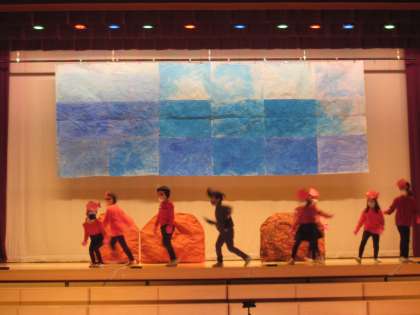 演目「スイミー」は、仲間を失ったスイミーがマグロたちに食べられることなく自由に海を泳げるように、みんなで集まって大きな魚のふりをして泳ぐことを提案しながら成長していく物語です。2年生の子どもたちは担任の先生が奏でるピアノに合わせて海の生き物たちを演じました。