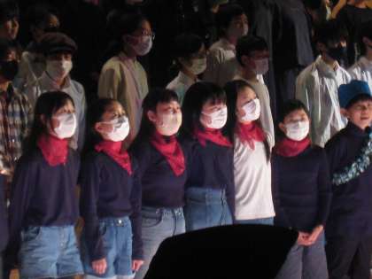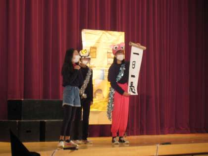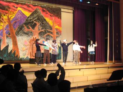 演目「魔法をすてたマジョリン」は、劇団四季のオリジナルミュージカルです。123才の小学生のマジョリンが、年に1度、魔の山で開かれる魔女の夜祭りがどうしてものぞいてみたくて、こっそりお祭りにもぐりこみ、たくさんの困難を乗り越える物語です。マジョリンと村の人々の心温まる交流を合奏や合唱を交えながら学年全員で精一杯演じました。