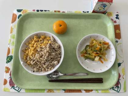 献立 めだいのそぼろご飯 にんじんサラダ みかん 牛乳