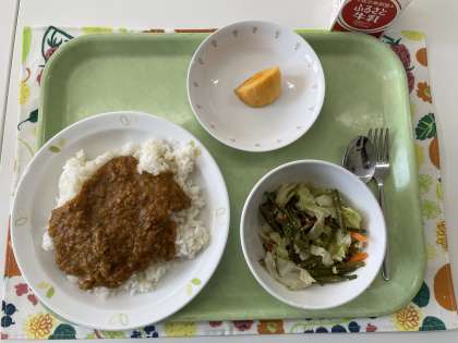 献立 エリンギのキーマカレー くきわかめのサラダ 柿 牛乳