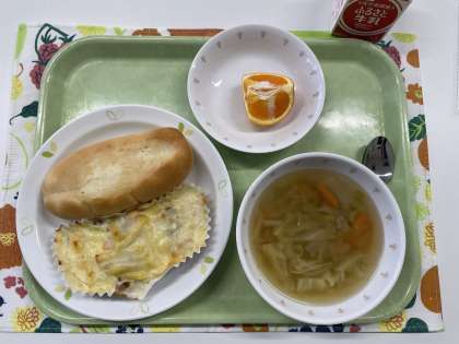 献立 ソフトフランス マカロニとえびのグラタン 野菜スープ はれひめ 牛乳