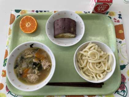 献立 ちゃんこうどん 焼きいも 花みかん 牛乳