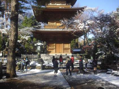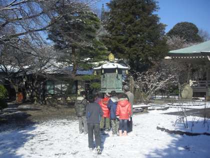 昨夜の雪が残る豪徳寺の境内で、子どもたちは俳句の材料を集めました。空は澄みわたり、建物と木々にはうっすらと雪が積もっています。いつもと異なる風景を堪能し、気付いたことをたくさんノートに記してきました。