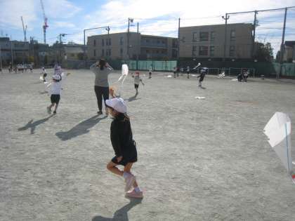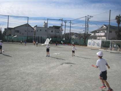 1月12日、1年生が生活科の授業「冬と友だち」で凧揚げを楽しみました。子どもたちは自分で作った凧を風に乗せて空高く飛ばしていました。