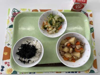 献立 七分づきごはん ひじきふりかけ 肉じゃが ブロッコリーとキャベツのごまサラダ 牛乳