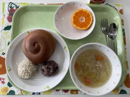 献立 ココアパン 紅白チンジュワンズ 白菜のスープ はれひめ 牛乳