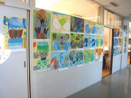 2年生の教室前の廊下壁面に子供たちが制作した図工作品を展示しています。題材名は「ふしぎなたまごからうまれたよ」、思い思いの不思議な卵と生まれてきた生き物を描きました。子供たちが楽しみながら描いた絵は夢のあるイメージに仕上がっています。