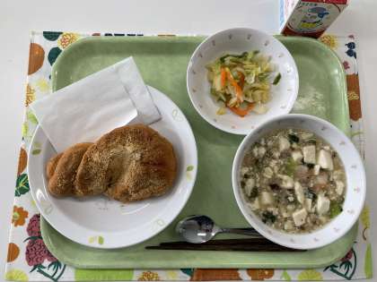 献立 きなこ揚げパン えびとチンゲン菜のとうふあん 白菜の中華サラダ 牛乳