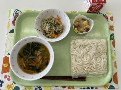 献立 ソフトめん 五目あんかけ じゃこサラダ おにまんじゅう