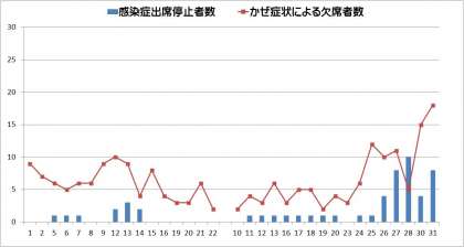 区内の小・中学校では、インフルエンザによる欠席者数が急増してきているようです。