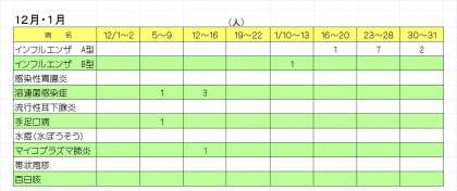 12月と1月の【学校感染症発生状況】と【カゼ症状による欠席状況】とお知らせいたします。