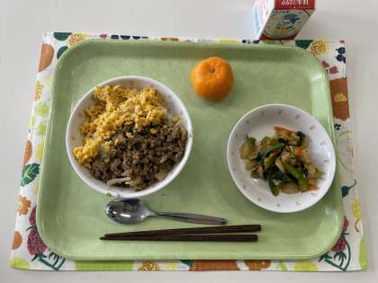 献立 飛び魚そぼろご飯 白菜のポン酢和え ぽんかん 牛乳