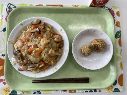 献立 あんかけ焼きそば さつま芋のごま団子 牛乳