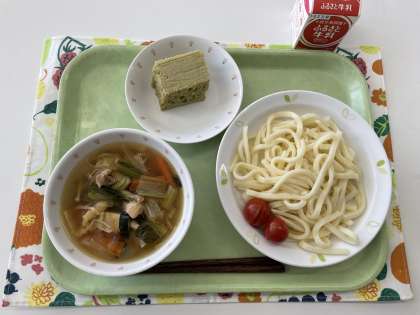 献立 肉汁つけうどん ミニトマト よもぎの浮島 牛乳
